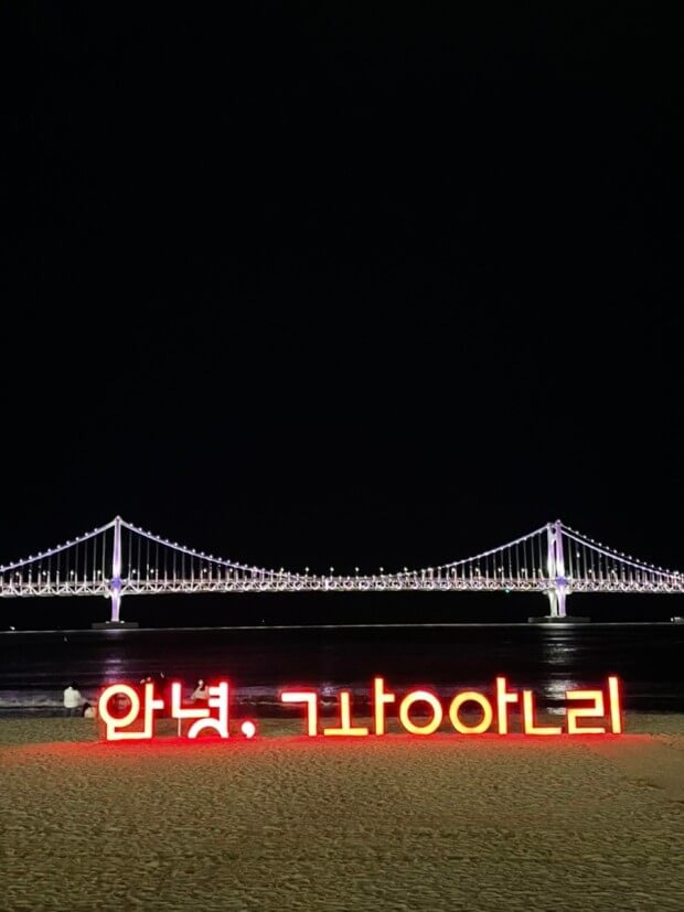 광안리 해수욕장 어디서나 드론쇼를 감상할 수 있지만, 가장 좋은 관람 명당은 '안녕 광안리' 조형물 포토존 옆 해수욕장 구역입니다. 이곳에서 드론이 광안대교를 배경으로 펼치는 공연을 정면에서 볼 수 있습니다.